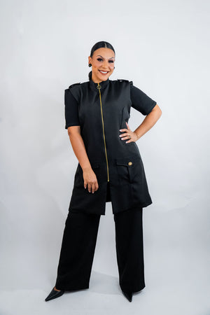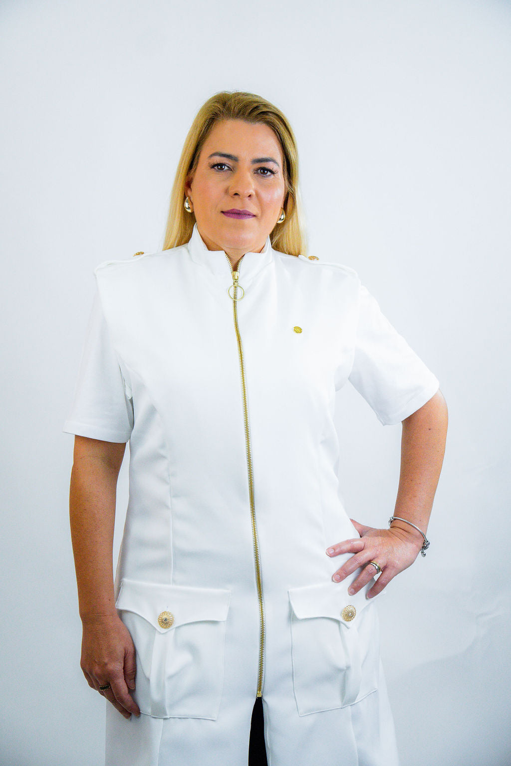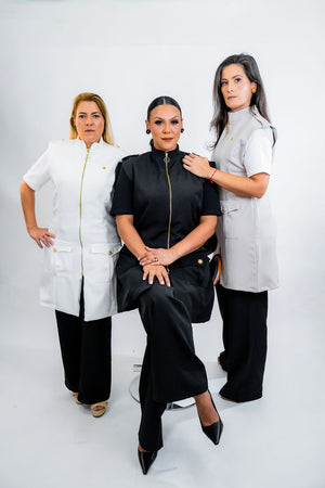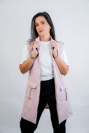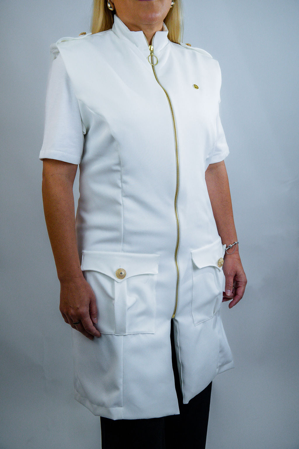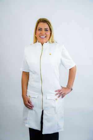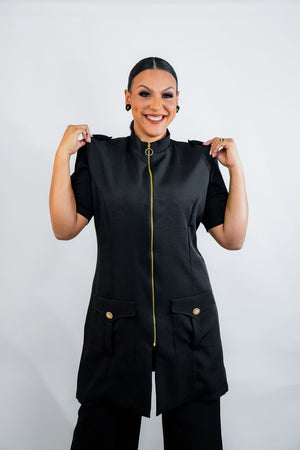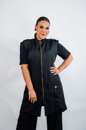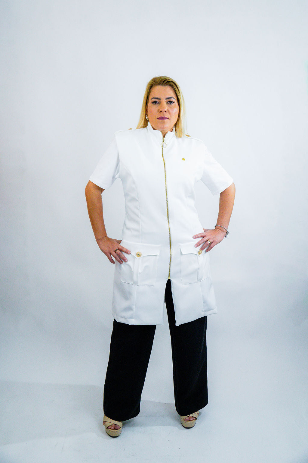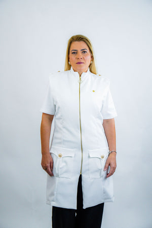 Corte clásico, ajuste y estructura perfecta con estilizado cuello cura, discretos bolsillos delanteros diagonales, digno de sastrería, su ajuste es impecable y entallado.