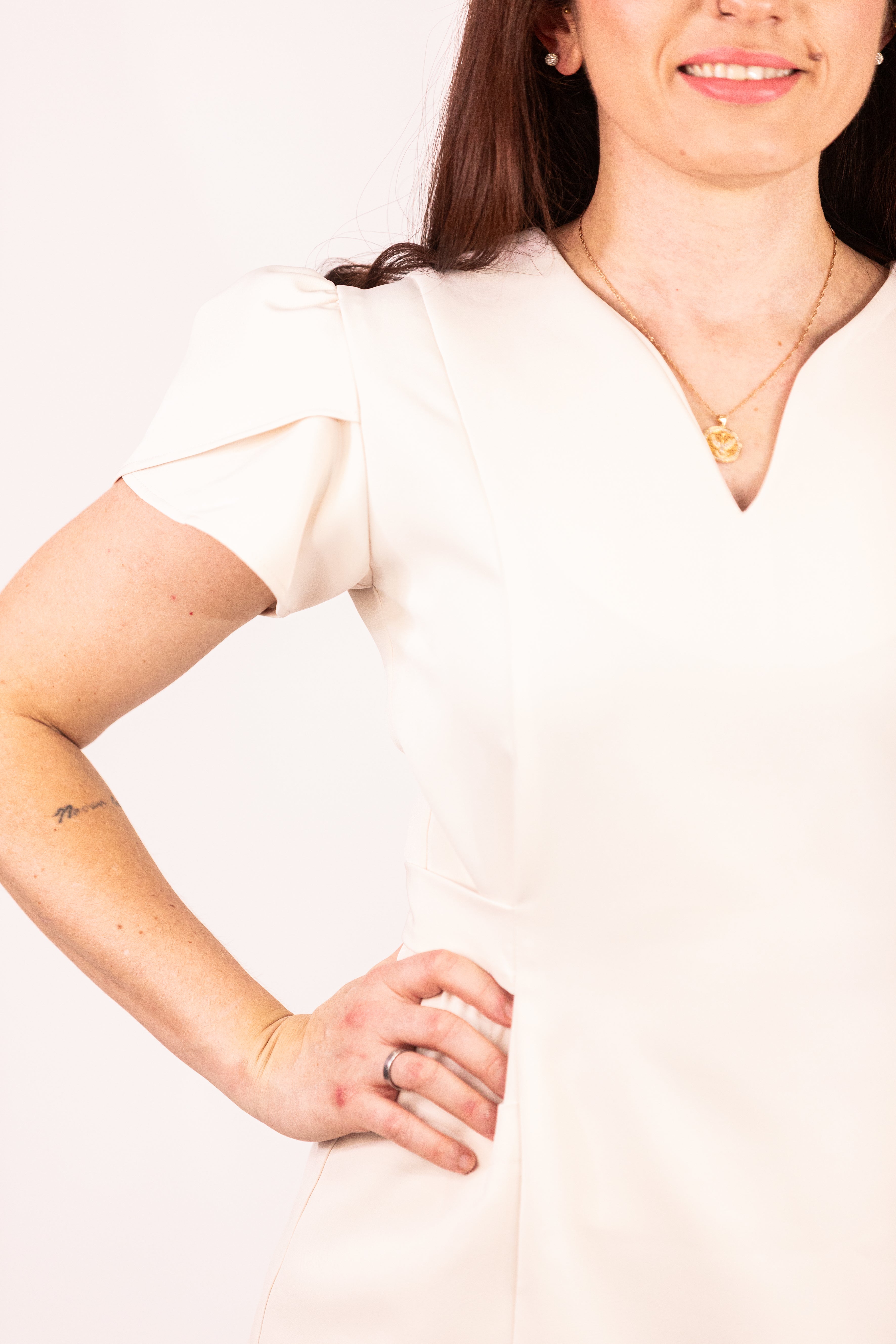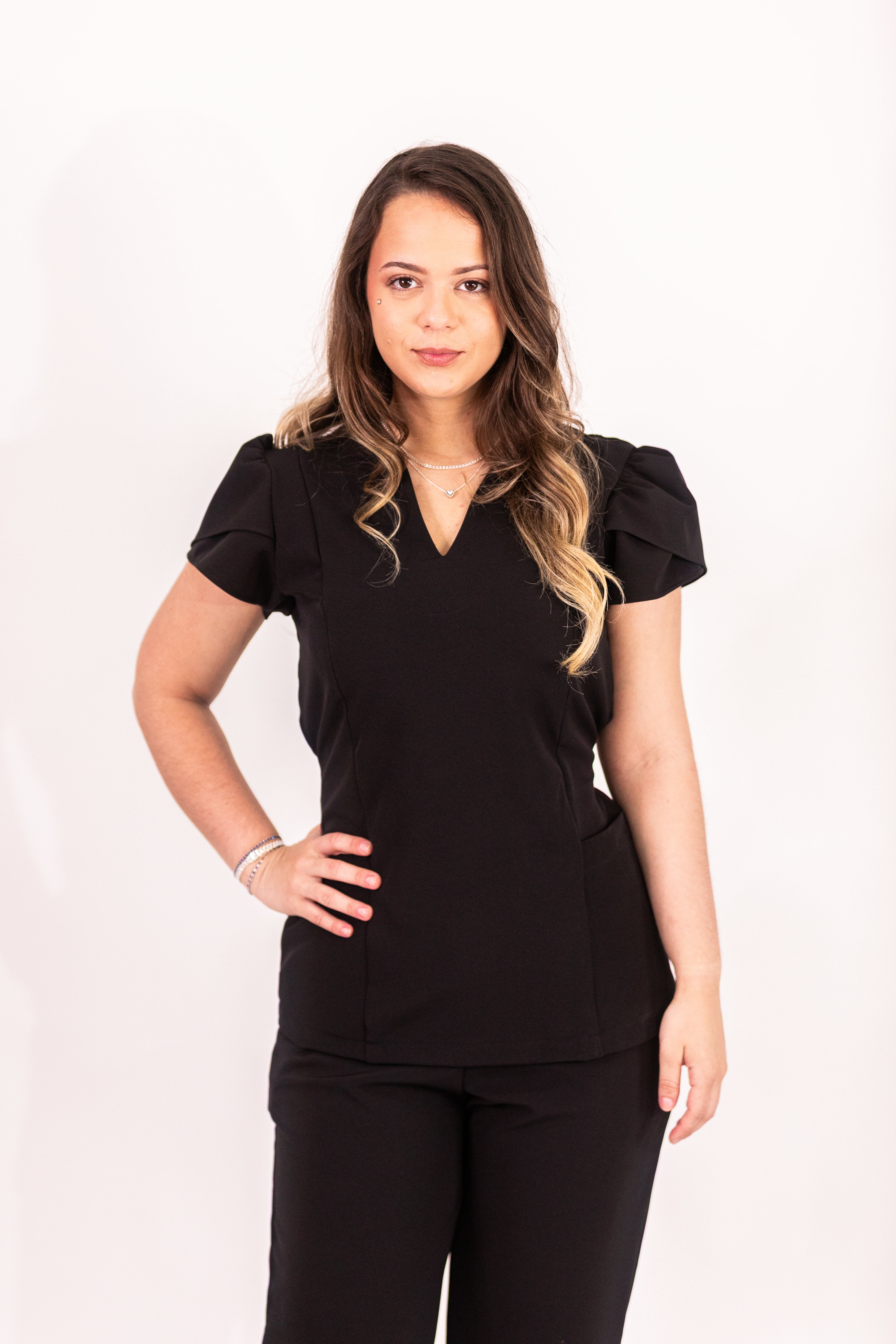 La blusa tiene un cuello con escote en V profundo y discreto, con cuello cura, aportando encanto al look y realzando la zona del cuello, con mucha discreción. Las mangas tienen forma anatómica y arqueada, proporcionando comodidad y el uso de otras piezas debajo, sin perder su movimiento.