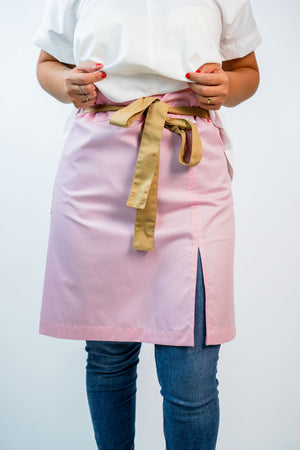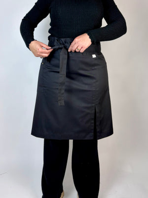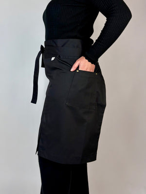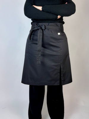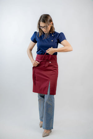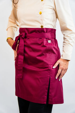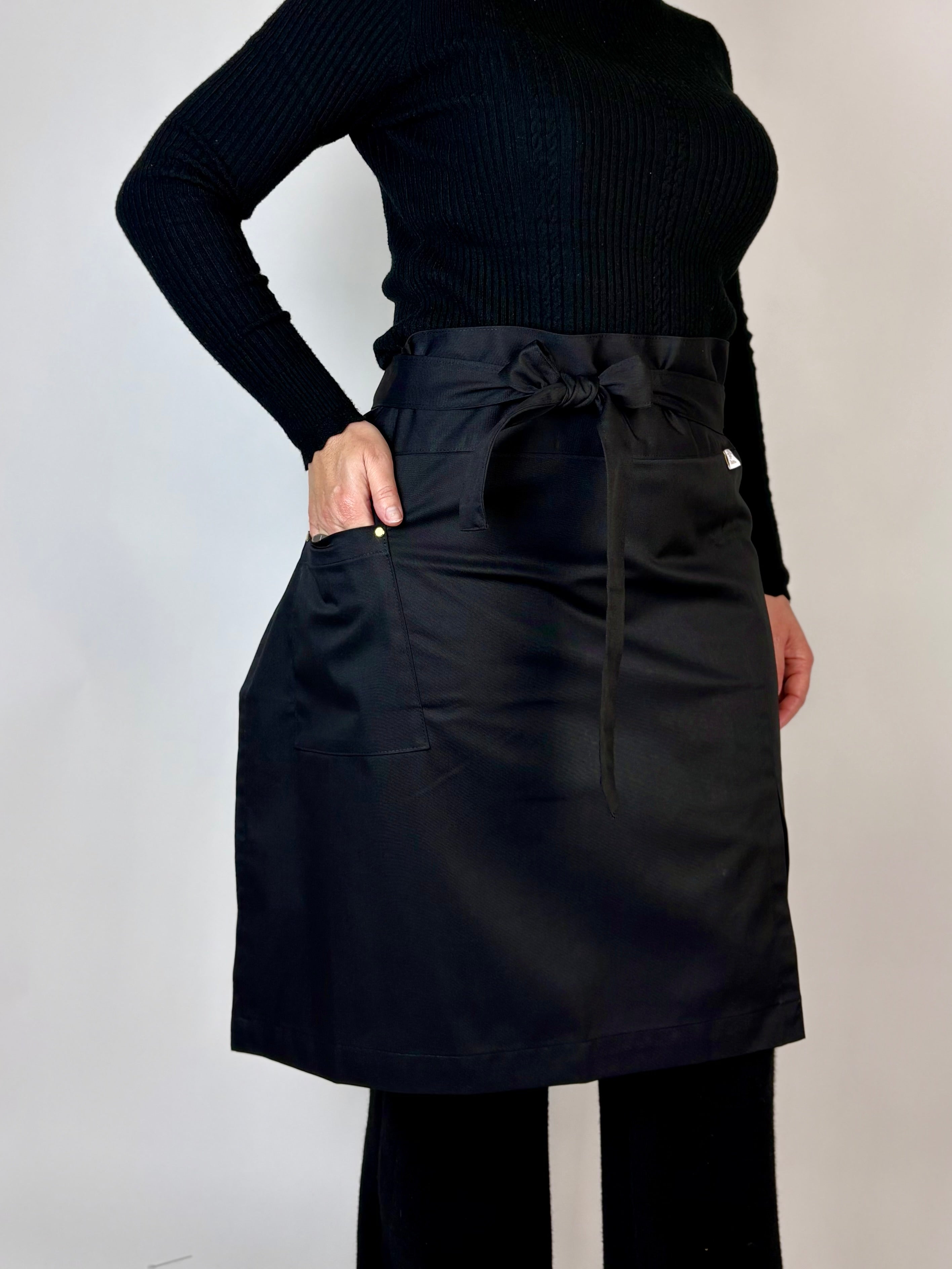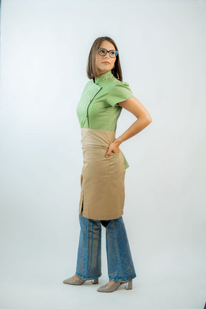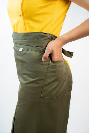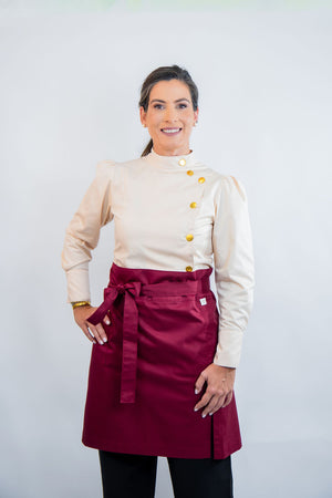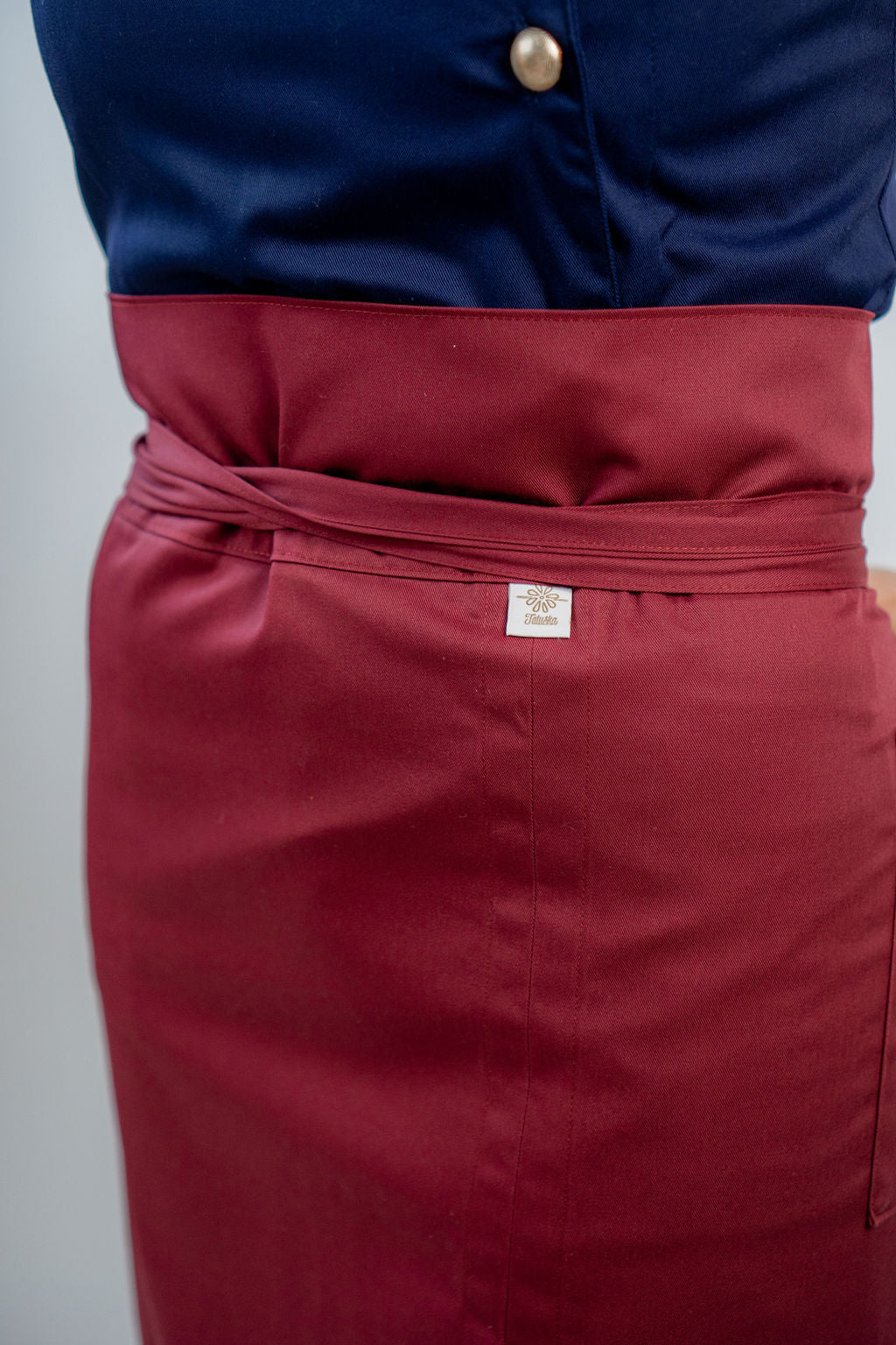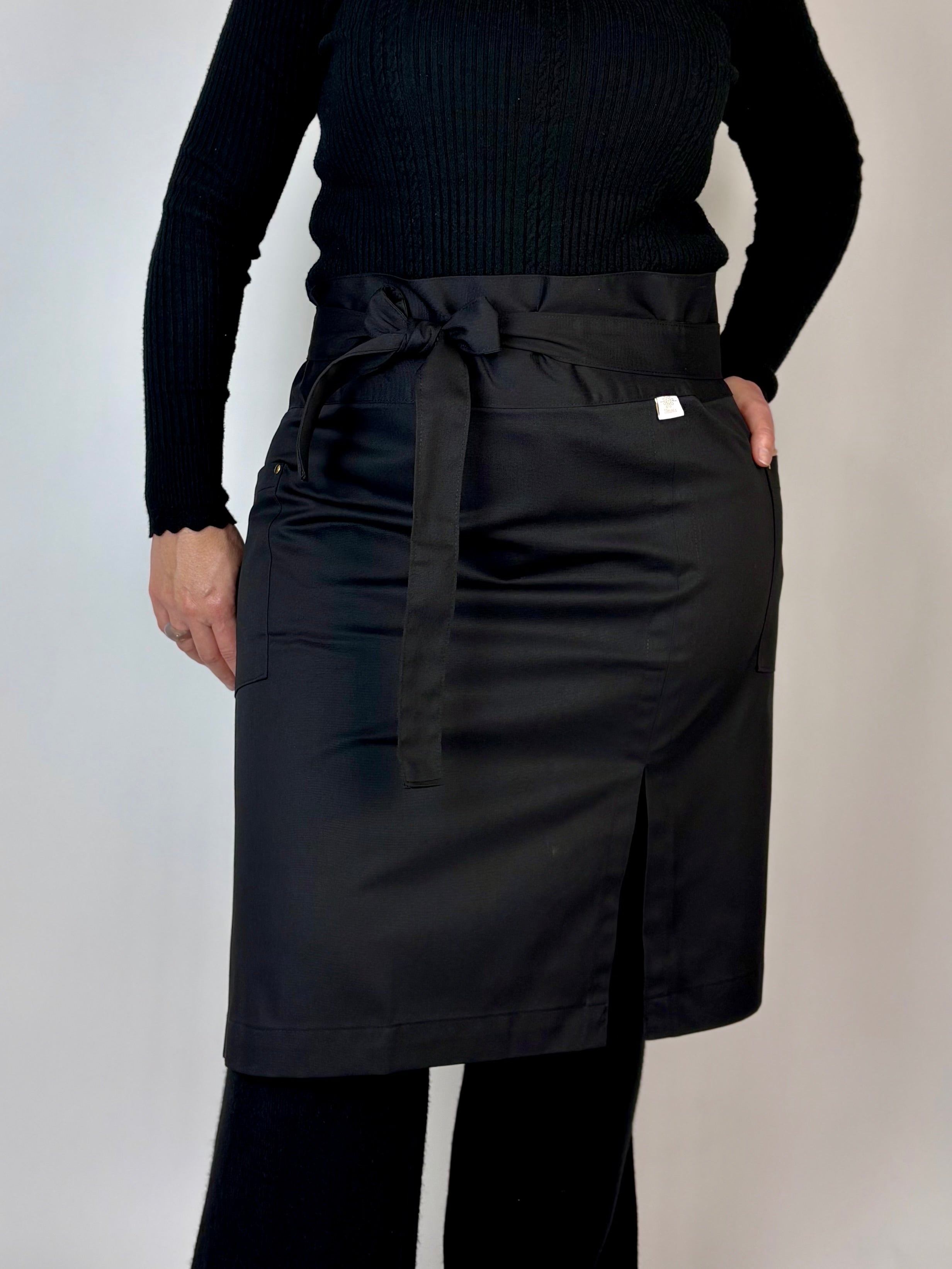 O Avental Aurora remete à uma saia em alfaiataria tipo secretária. É fabricado em tecido encorpado de sarja, oferecendo segurança e muito estilo. Possui cintura alta demarcada e cinta em tecido (na mesma cor ou não) na peça, deixando a produção super elegante. Possui fenda lateral reforçada, para melhor locomoção e bolsos auxiliares traseiros para servir de apoio.
