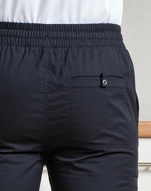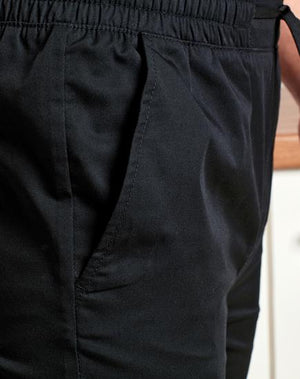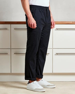 Com várias bolsos funcionais, cintura elástica com cordão de ajuste e simulação de braguilha, garantem conforto absoluto durante todo o turno. O corte afunilado nas pernas, com dobras opcionais na bainha, oferece um toque descontraído e contemporâneo, perfeito para ambientes modernos de restauração.