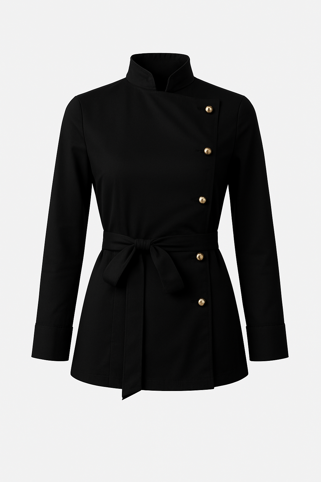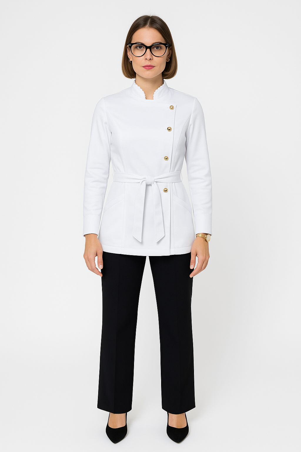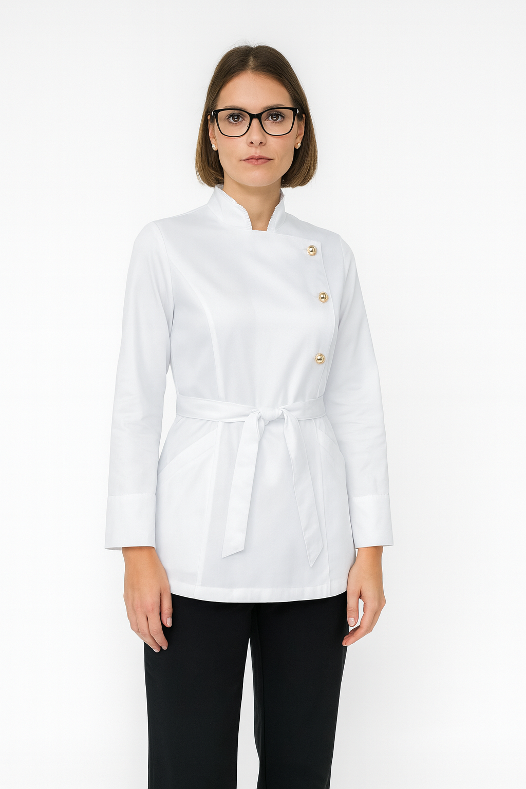 Imponente e refinado, o Dólmã Selene é a escolha perfeita para profissionais que desejam unir elegância, praticidade e presença. Confeccionado em sarja 100% algodão com corte cintado, possui faixa para destacar a cintura e acabamentos impecáveis, ele traduz uma estética clássica com toque contemporâneo — ideal para quem quer se destacar com maturidade e autoridade.