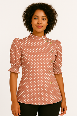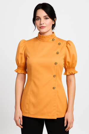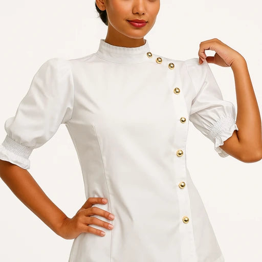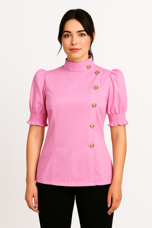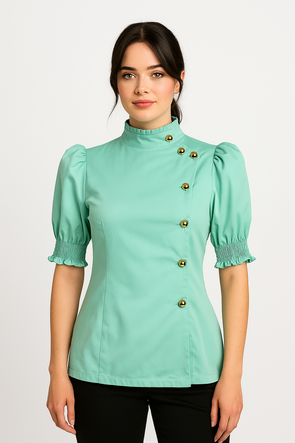 O Dólmã Ligth Fluído Hebe (bata) é de tecido mais leve, com botões metalizados e possui gola com folhos. O Modelo traspassada, deixa a produção super elegante. A manga curta alongada possui efeito bufante, com punho em elástico, o que permite ser totalmente ajustado ao braço, proporcionando total conforto.