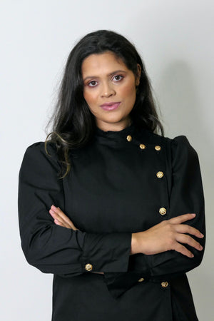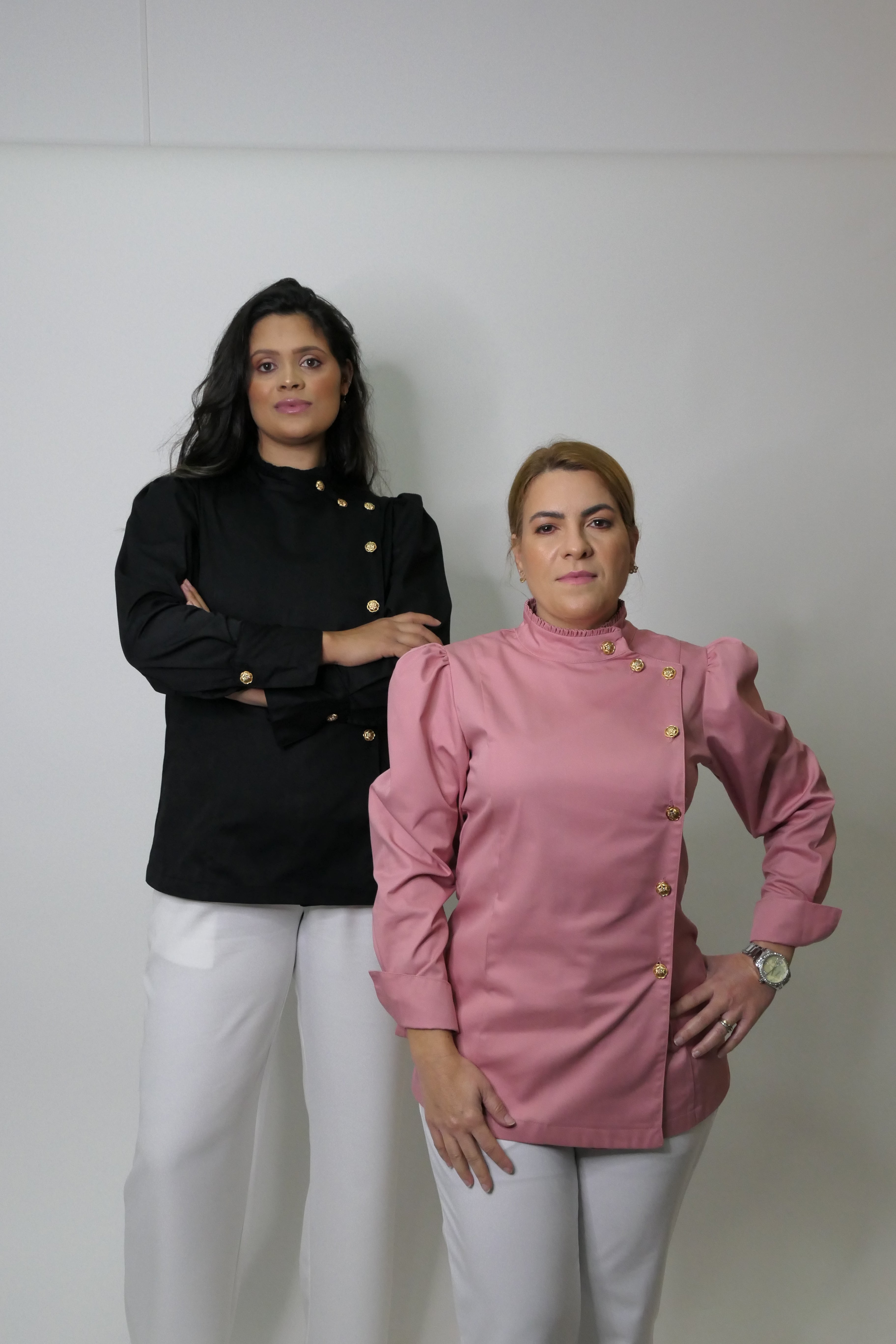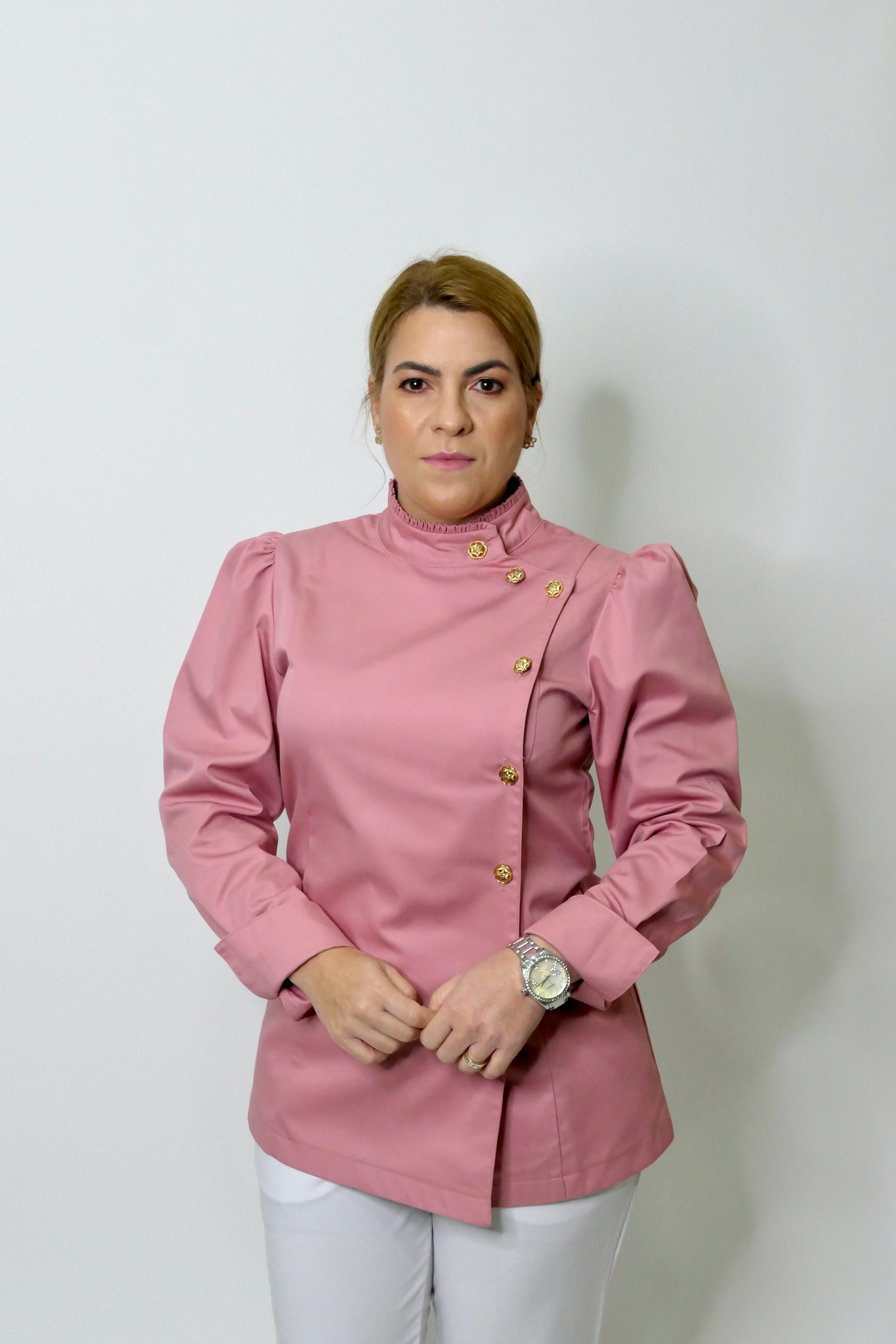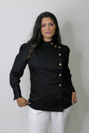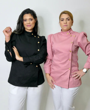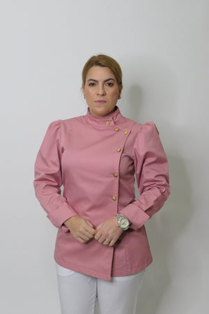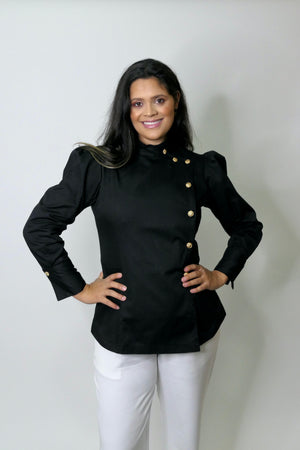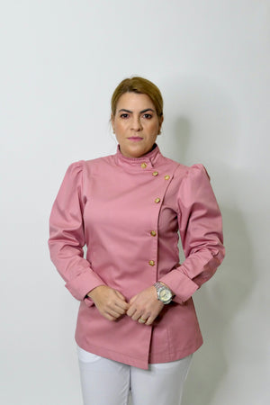 O Dólmã Hera Fantasy é uma edição especial, confeccionada em Sarja Encorpada e macia de Algodão, com mangas bufantes Princesa, gola redonda e traspassada, com um lindo e delicado Folho Franzido. Esta modelagem moderna e ajustada ao corpo, possui mangas longas, punhos largos estruturados e botão em Flores metálicas douradas, que oferece um charme, com muito requinte para a peça.