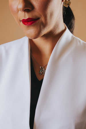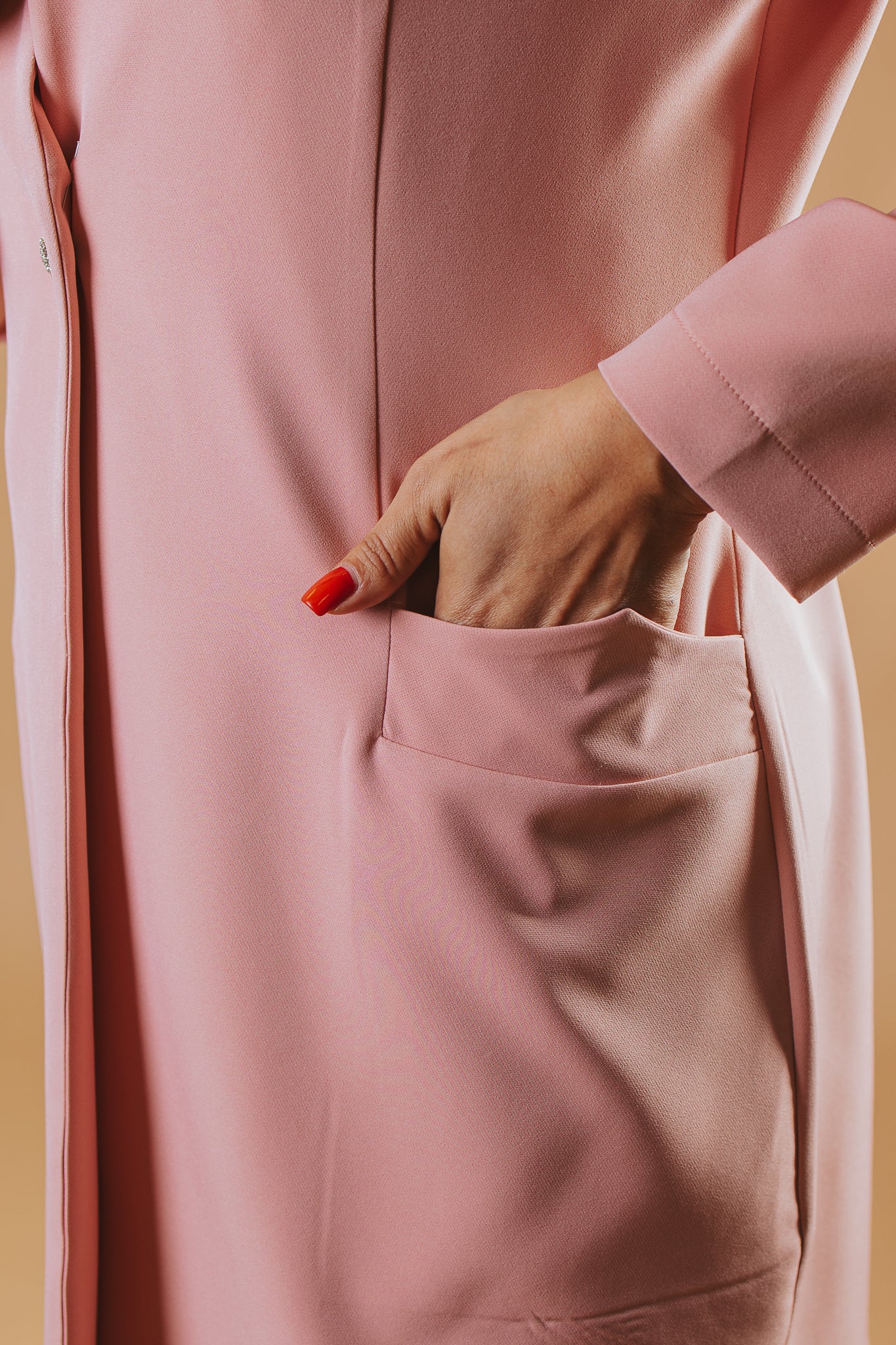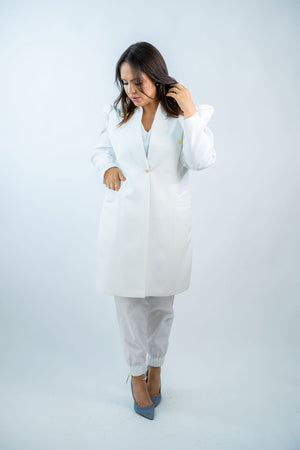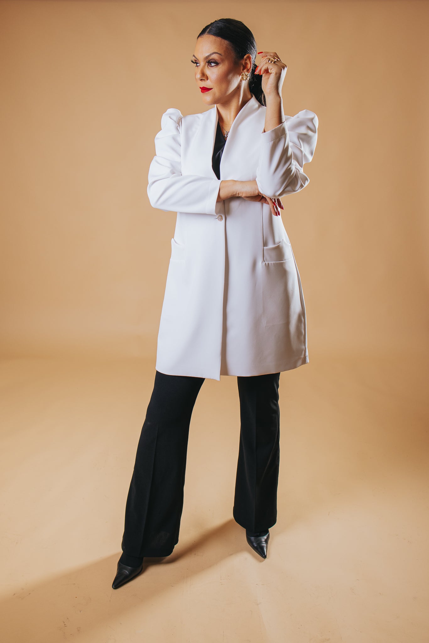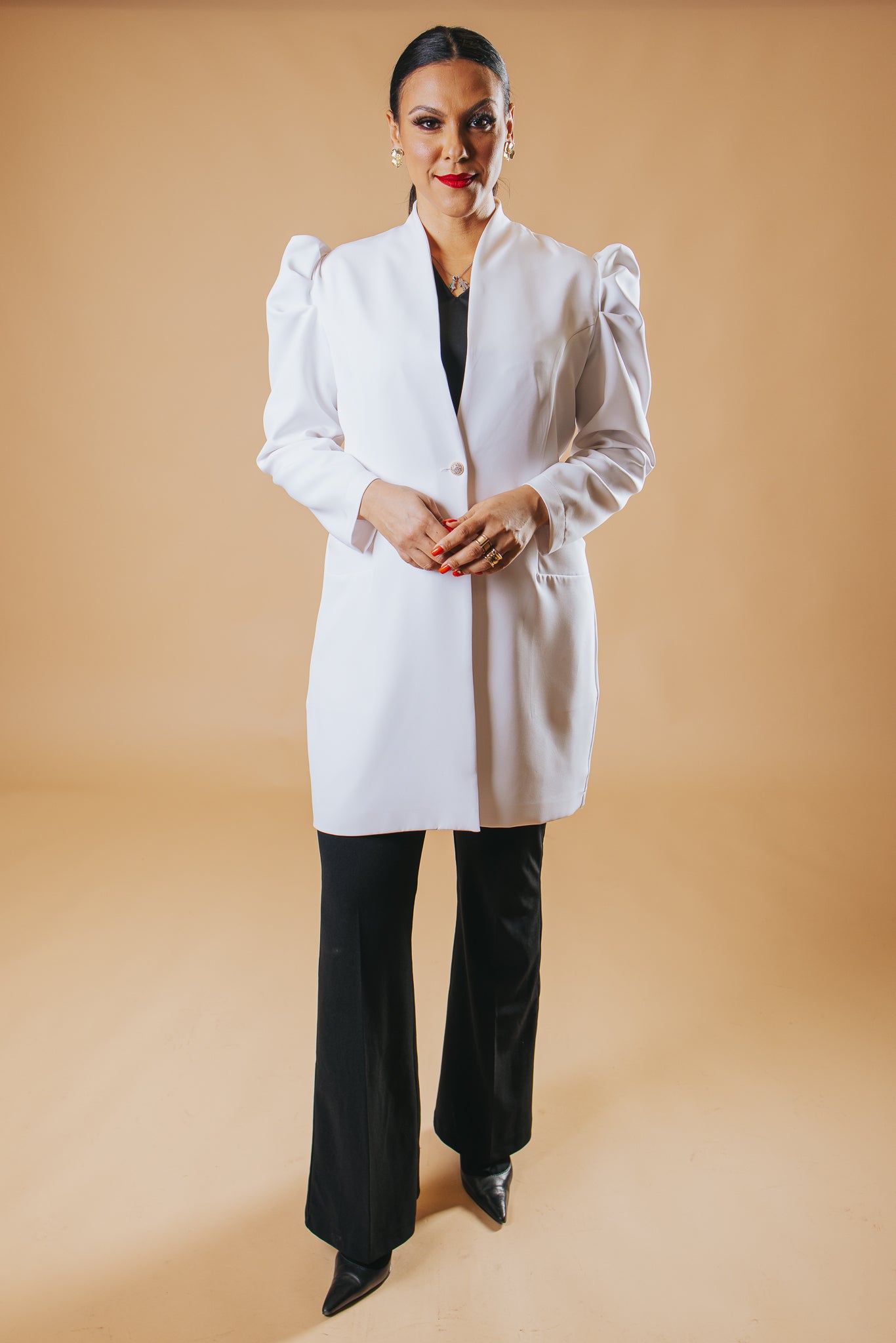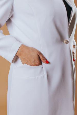 O Jaleco Meliá midi é fabricado em tecido nobre, trabalhado em tramas texturizadas, com elasticidade, que oferecem um toque macio e elegante de alfaiataria. Botões inoxidáveis de Strass na cor dourada, são de extrema sofisticação.