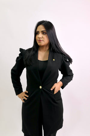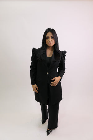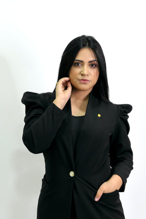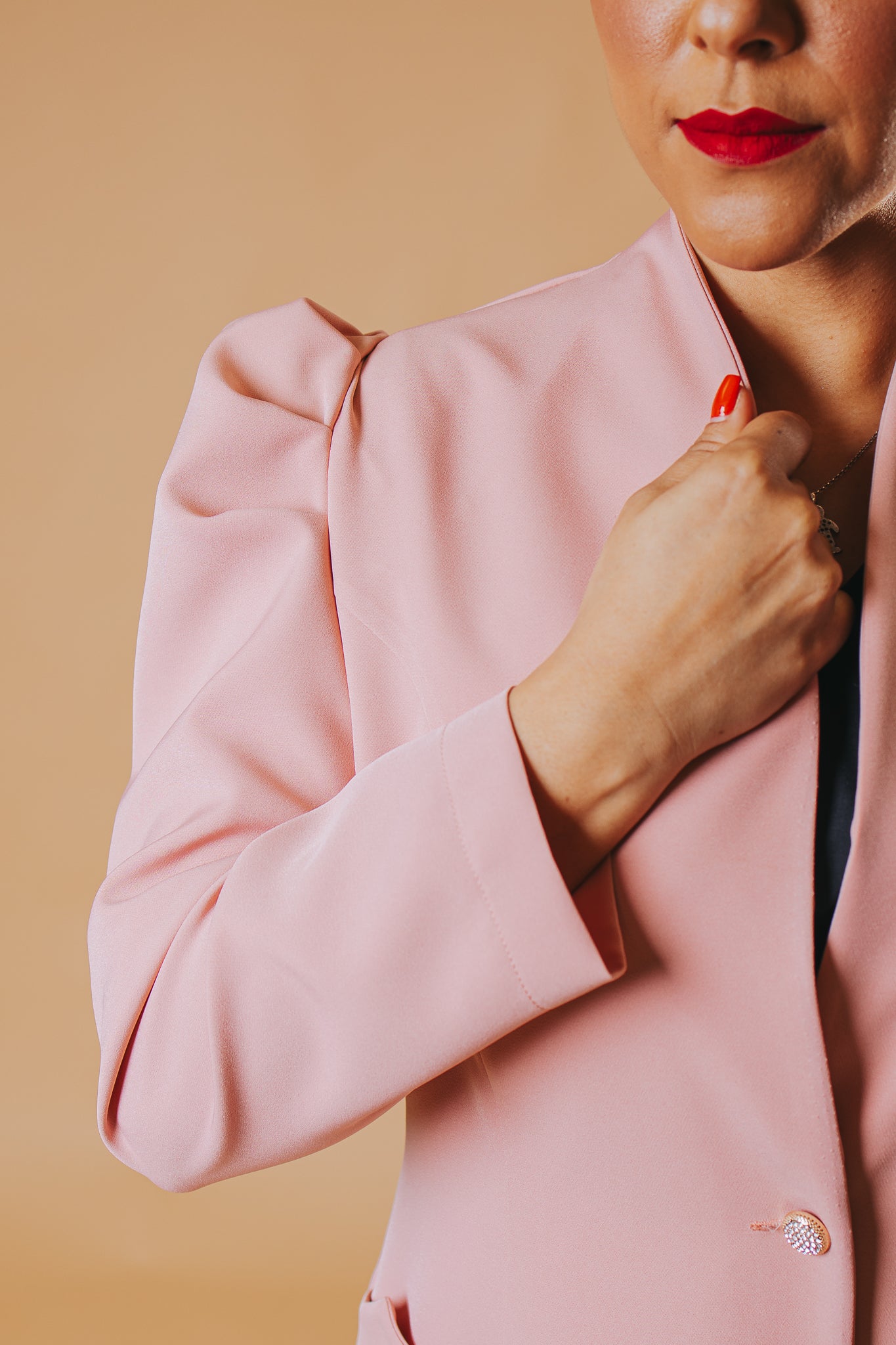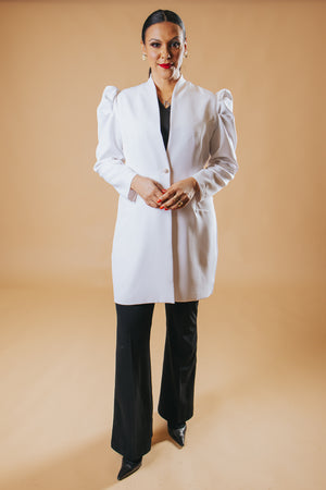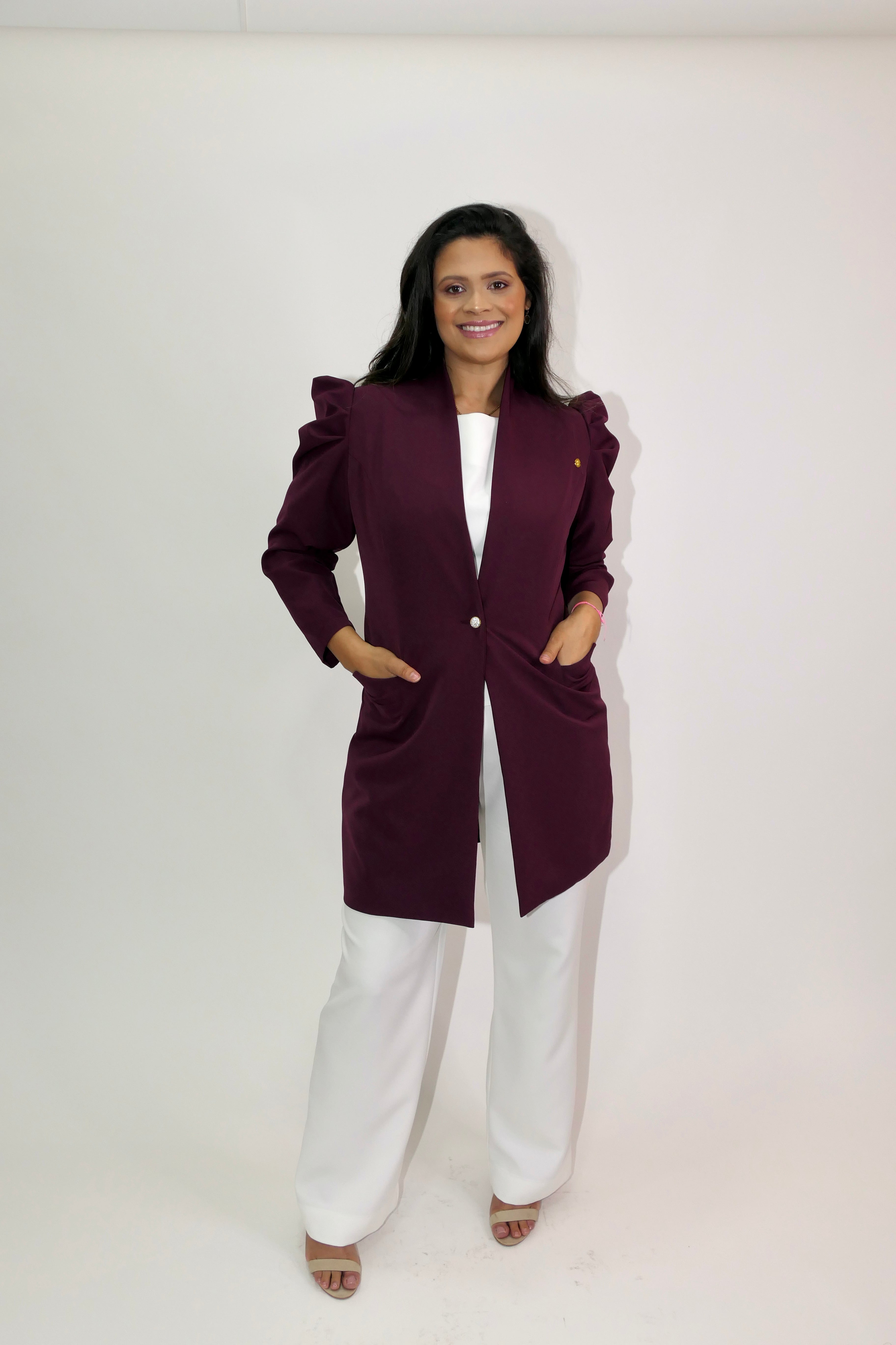 Corte e gola Princesa, com discreto fechamento frontal, possui manga sofisticada em pregas, com um caimento impecávele e estrutura perfeita. O corte dos bolsos estilizados, garantem o efeito imperial proposto na peça, digno de Alfaiataria.