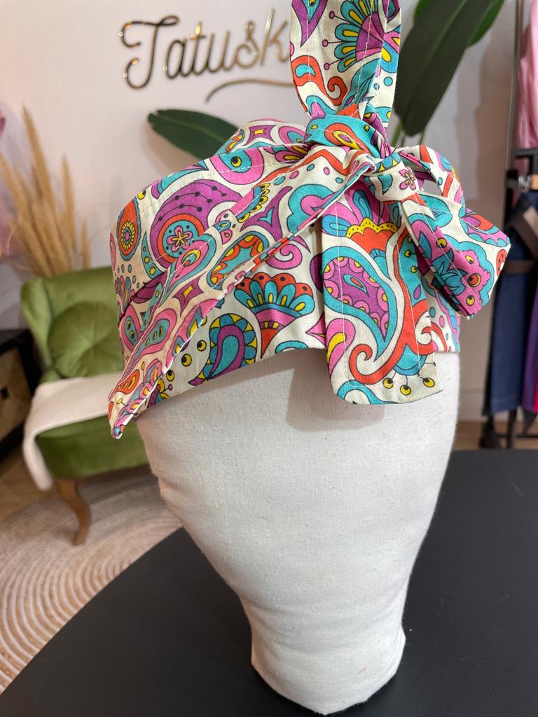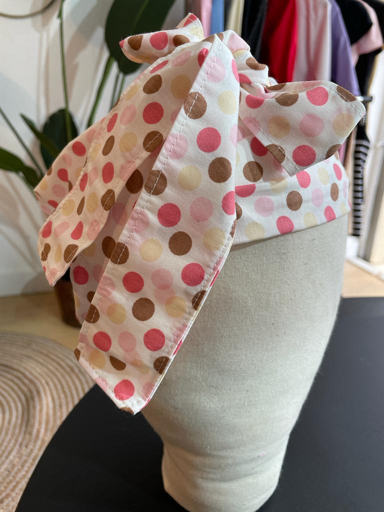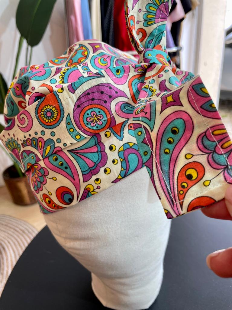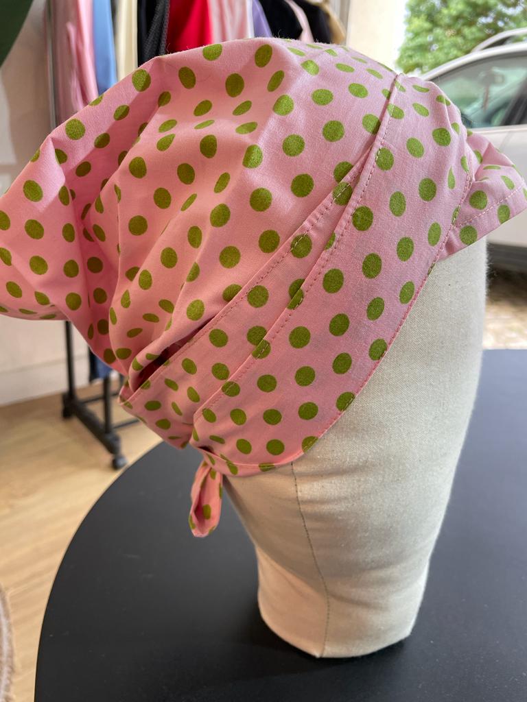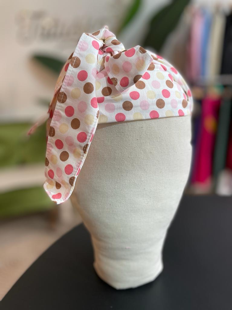 Modelo versátil, assemelha-se a uma touca, com abertura traseira e fita larga, para amarração na cabeça, com laço.